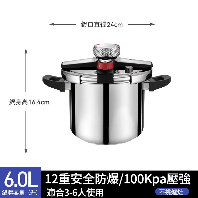 半小時前【2025年開春季】燃氣電磁爐通用【德國進口】304不鏽鋼壓力鍋 煮飯/熬粥/炖肉 自動限壓閥排氣保護安全防爆 耐用20年不壞 不滿意包退換 - 升級加厚 6L【適合1-4人使用】304不鏽鋼壓力鍋
