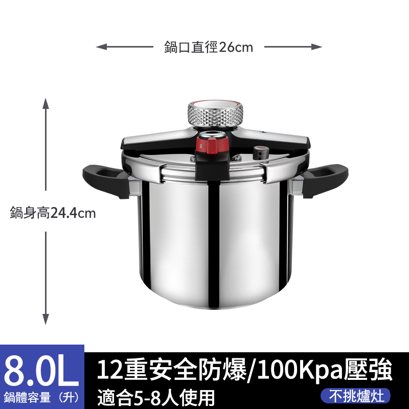 25分鐘前【2025年開春季】燃氣電磁爐通用【德國進口】304不鏽鋼壓力鍋 煮飯/熬粥/炖肉 自動限壓閥排氣保護安全防爆 耐用20年不壞 不滿意包退換 - 升級加厚 8L【適合5-8人使用】304不鏽鋼壓力鍋