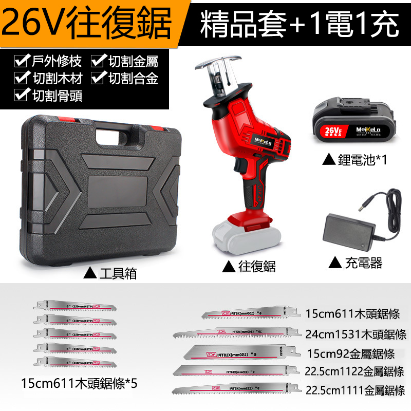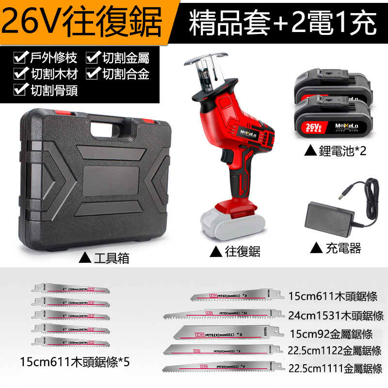 12分鐘前【德國精工鋰電鋸】鋼、鐵、磚頭、木材,統統都能鋸!續航久、充電快,方便攜帶,一機多用 - 26V德國精工往複鋸(機頭+1充1電)贈塑箱+5鋸條+大/5鋸條NT$2190