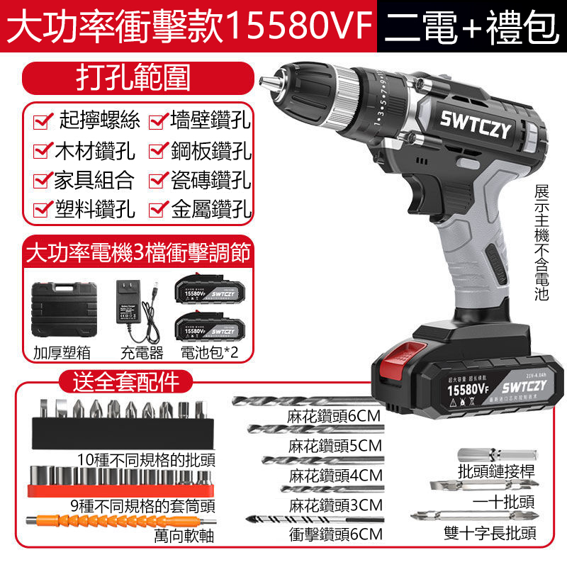 7分鐘前德國大功率 雙速衝擊鋰電鑽 純銅電機 無極變速 雙軸承設計 十年換新 - 進口衝擊15580VF塑箱2電+豪禮 NT$1980