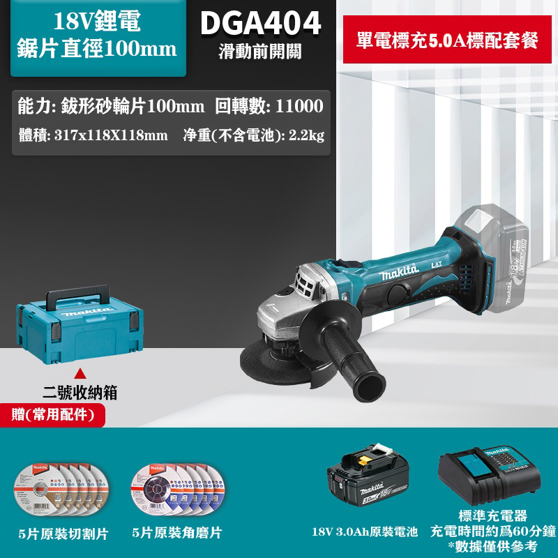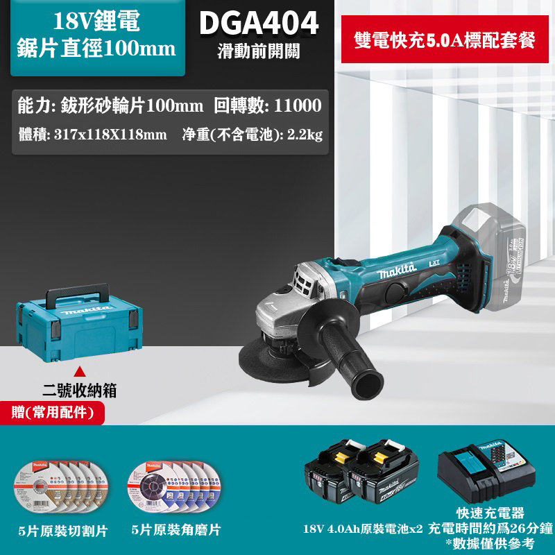 11分鐘前【Makita/牧田】DGA404 18V充電式砂輪機,變速!是同類產品中最安靜的角磨機之一 - 18V鋰電雙電快充5.0Ah組